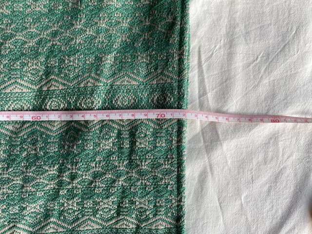 緑の糸はわりとしっかりした緑なんですが、ナチュラルホワイトの糸がグレージュというか、くすんだ感じの色なので、全体としては落ち着いた色味です。ディディモスの緑系のラップって結構派手な明るい色が多いのですが、この布は派手さはまったくなし。気持ちがほっこりします。