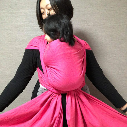 この布はリネンの配合が多いため、するりんと滑りがよく、引き締めがとても簡単です。下手するとだっこ中に若干緩んでくるかも!?というくらい滑りがいいので、子どもを抱き入れた後に念入りにテールを引っ張ったり、リング部分に巻きつけたりして弛まないように工夫して使っています。