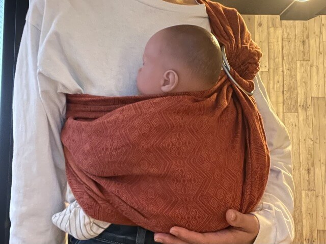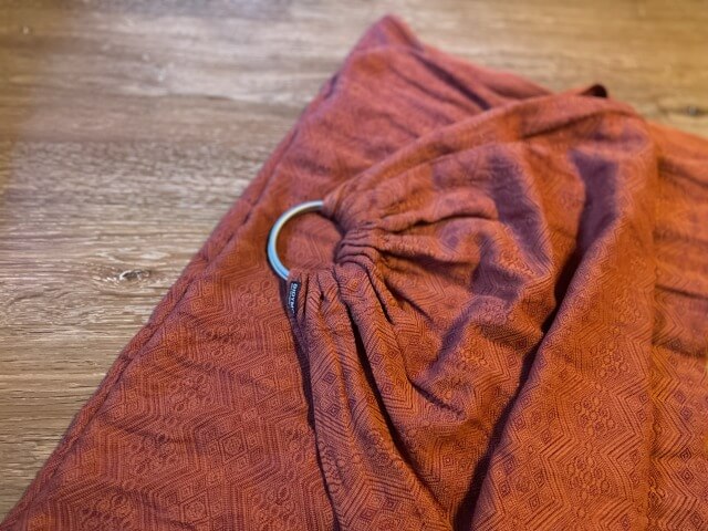 この布はリネンの配合が多いため、するりんと滑りがよく、引き締めがとても簡単です。下手するとだっこ中に若干緩んでくるかも!?というくらい滑りがいいので、子どもを抱き入れた後に念入りにテールを引っ張ったり、リング部分に巻きつけたりして弛まないように工夫して使っています。
